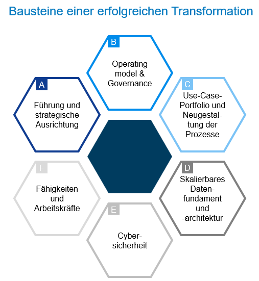 Um Veränderungen im Kern eines Unternehmens wirksam zu verankern, muss die Transformation von der obersten Führungsebene getragen werden. Strategische Ambitionen und Entscheidungen müssen transparent kommuniziert werden, damit die Organisation voranschreiten und auch potenziell anspruchsvolle Veränderungen mittragen kann. Strategische Fragestellungen mit Auswirkungen auf operative Umsetzungsschritte – etwa der Aufbau interner Ressourcen im Vergleich zu Partnerschaften – sind dabei frühzeitig zu klären. Ebenso müssen bei langfristigen Datenstrategien von Beginn an geopolitische Risiken und das Kosten-Umsatzziel-Spannungsfeld beachtet werden. So bereiten die strategischen Leitplanken das Unternehmen auf unterschiedliche Zukunftsszenarien vor.