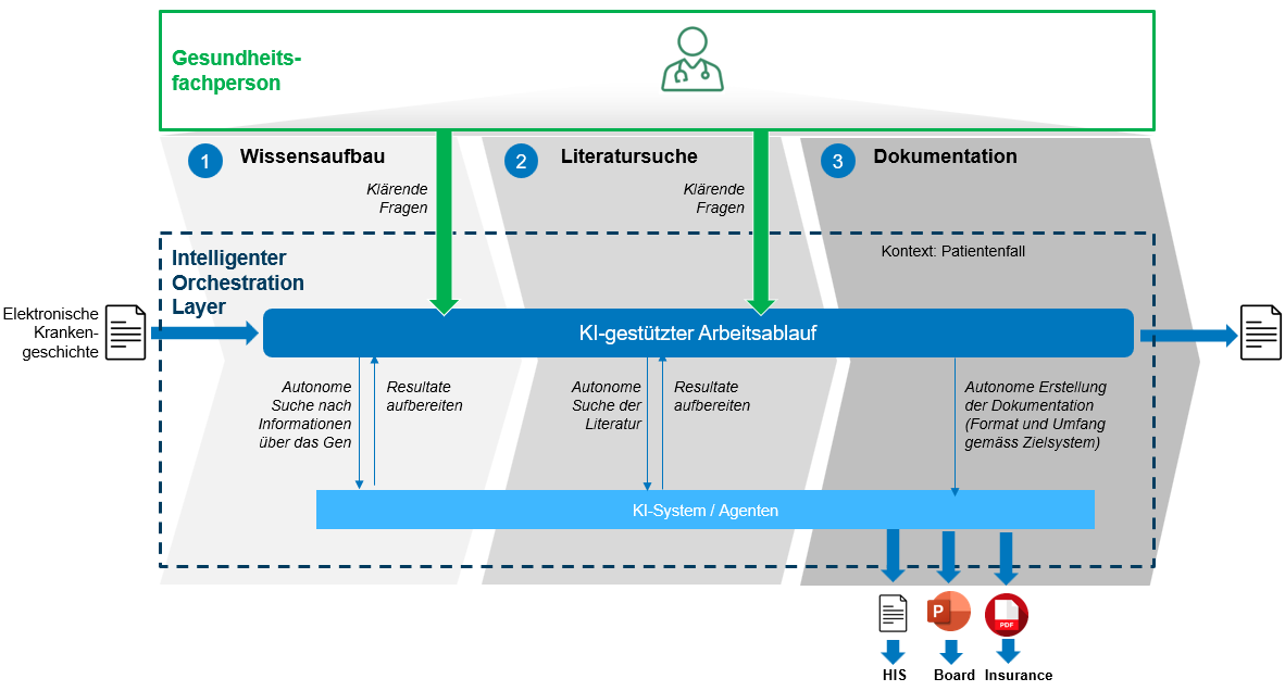 Nach der Freigabe erstellt die KI die erforderliche Dokumentation für die jeweiligen Stakeholder: Ein Schweizer Krankenversicherer benötigt andere Informationen als das Tumorboard. Entsprechend generiert das System unterschiedliche PDFs, die durch einen Menschen kontrolliert werden.