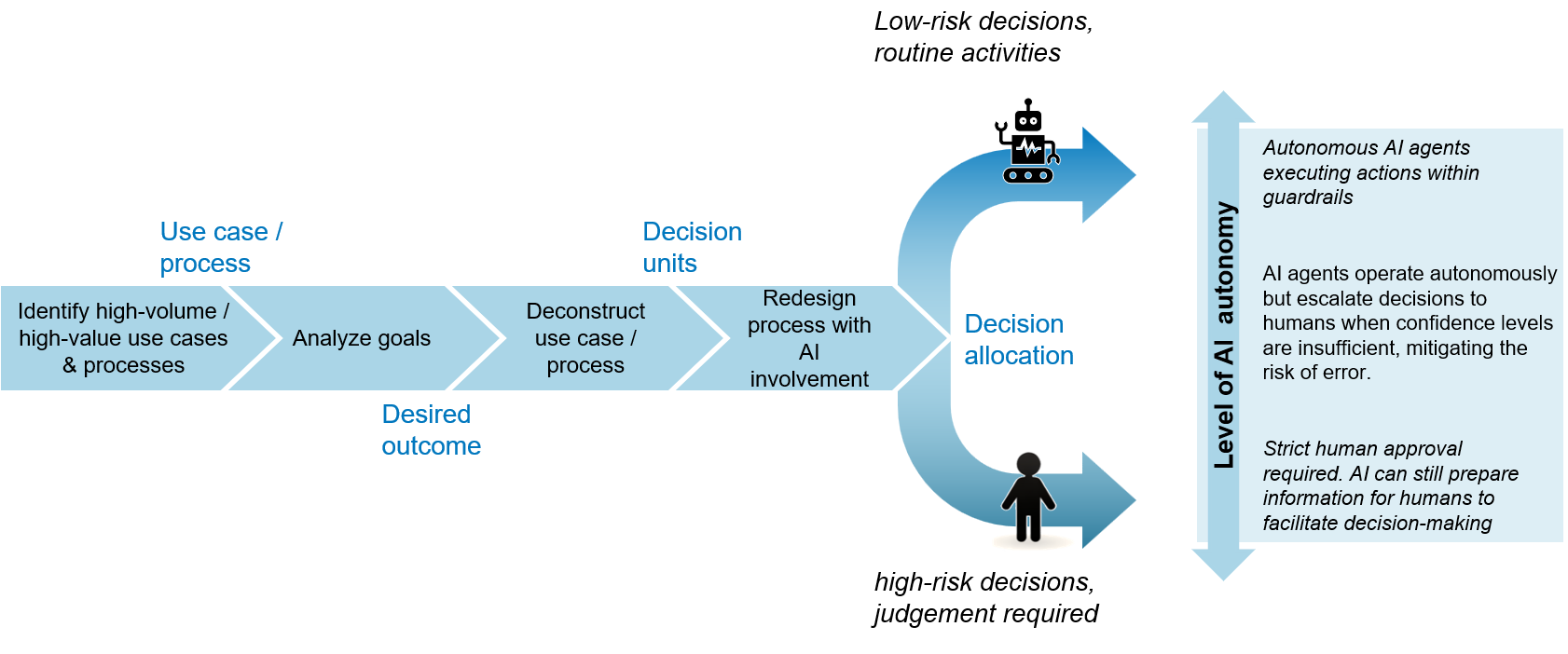 The goal is not to simply take people out of the workflow, but to redesign use cases around intelligent human-AI collaboration. This starts with a clear analysis of the desired outcome: Outlining feasible and meaningful goals, how and whether new processes can be made possible due to enhanced technological capabilities, whether certain processes become redundant as the goals can be achieved differently, etc. Next, each use case is broken down and allocated to smaller decision units, establishing effective AI integration where possible: At each step, the system is provided with the required information only, to prevent context pollution – a common challenge when working with AI agents. Getting the decision allocation between human and system right is an essential part of the evolution: Depending on risk and other factors, the level of autonomy for an AI system can vary significantly. Regardless, accountability remains with human experts, at least through their responsibility of defining and maintaining the appropriate guardrails, such as defined risk thresholds, quality controls, bias checks, or explicit escalation criteria. Human intervention is triggered by elevated risk levels. This may require upskilling employees to strengthen decision-making and exception handling, as EU requirements stipulate that high-risk AI systems must be designed to enable effective human oversight and timely intervention, for example [2].